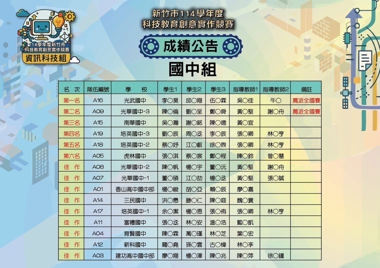 807 伍彥霖/809 李杰昊/810 邱楷翔 參加新竹市114學年度科技教育創意實作競賽~資訊科技組榮獲 國中組第一名,並將代表新竹市參加全國賽