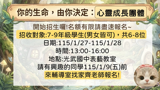 好康免費的寒假小團體來囉!!CP值超高的心靈成長小團體,歡迎7-9年級同學前往報名,名額有限要搶要快喔!全程參與可額外獲得小禮物一份!